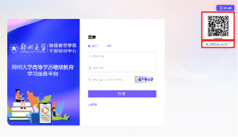 打开郑州大学高等学历继续教育学习服务平台首页(https://ols.v.zzu.edu.cn/cjstu/login),将鼠标移到右上角【移动端】显示二维码和郑大继教APK下载处(如图1),两种使用方式如下。
