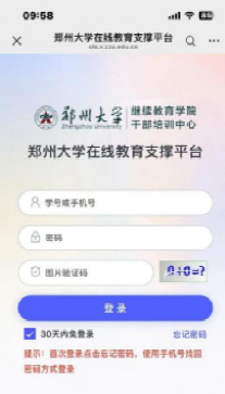 下载“郑大继教”APK安装包到安卓手机上(图1红色方框处),安装后手机桌面出现 “郑大继教” 图标,点击进入登录页,如图2。勾选“30 天内免登录”可减少后续重复登录操作。